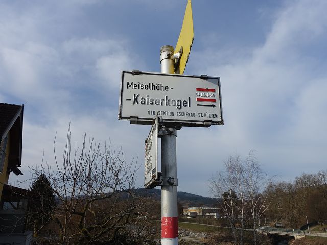 Sechs Kilometer ging es zunächst flach dahin, am Teichstüberl von Florian vorbei, danach passierte ich den Stadtteil Chinatown. Immer entlang der Bahntrasse wanderte ich bis zum Ortsteil Rotheau–Eschenau. In Rotheau überquerte ich die Traisen. Anschließend ging es auf Asphalt durch die Ansiedlung Steinbuch, bevor der 04er Weg nach links abbog und steil durch ein Waldstück nach oben führte.