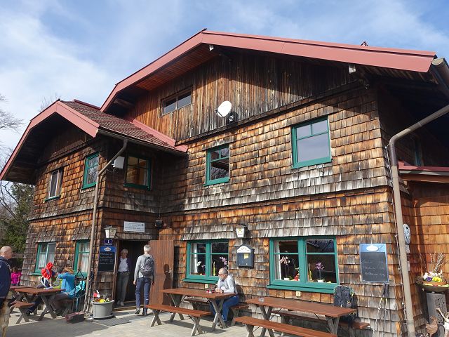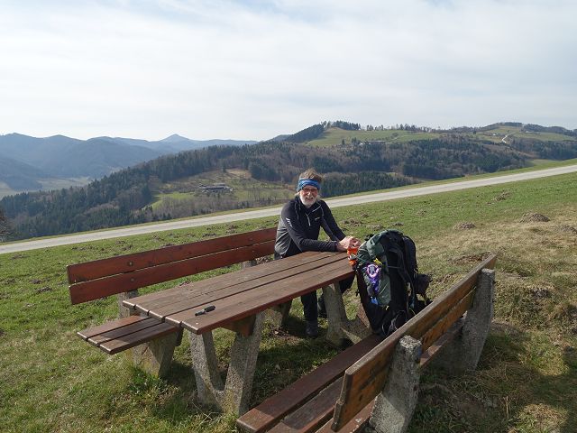 Ich holte mir meinen Stempel und legte eine kurze Kaffeepause ein. Das Wetter war optimal zum Wandern, allerdings wehte stellenweise ein kühler Wind. Nach dem Kaiserkogel-Gipfelkreuz trennten sich der NÖ Mariazellerweg 06 und der Voralpenweg 04 wieder.